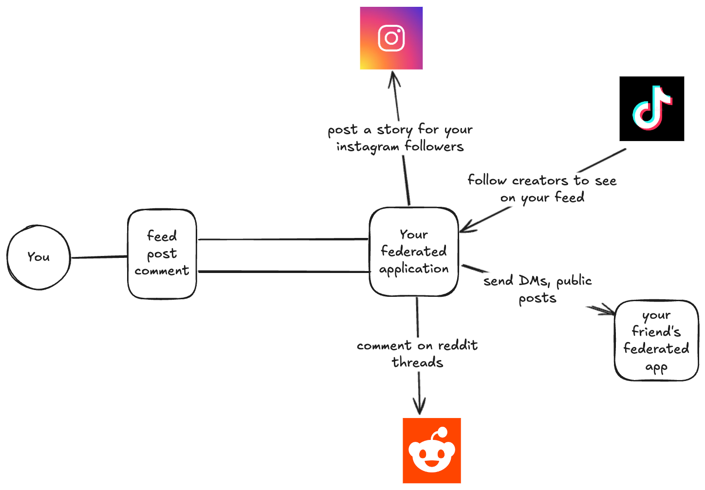 When you pull up your TikTok feed, scroll through Reddit, or even when relatives are posting on Facebook, we're all interacting with centralized infrastructure. These applications let you send and receive content with your friends and let you browse other content they host on their server (your feed). In exchange for hosting your content, and allowing you to continue using the app, they use your data for targeted ads, learning your habits, etc. Lately, these applications have also started closely controlling what you see when you're browsing these feeds (possibly influencing elections, etc. etc.).