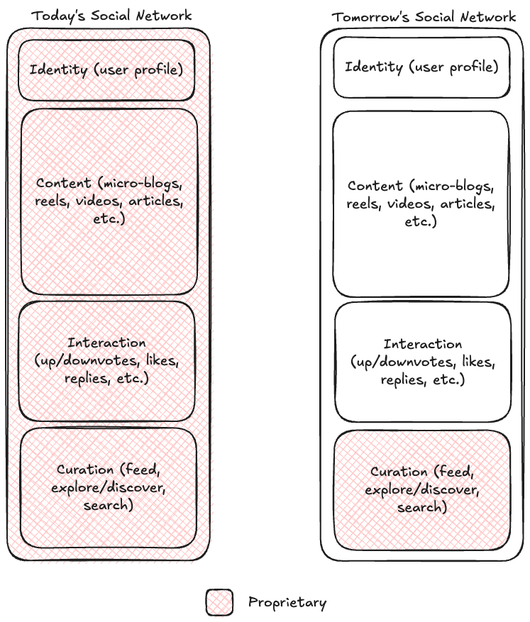 In a federated ecosystem, users own and control their own identities, content, and actions. Because of universal protocols (ActivityPub, ATProtocol, etc.), these concepts are universal, and act the same no matter what social network you're in. Some of these universal protocols enforce a chronological feed, others give the server freedom to determine its own algorithm. This is the key differentiator for social networks in a federated ecosystem. The Reddits, Facebooks, and TikToks can focus on curation. They can provide custom algorithms to users who can use them in their own applications.